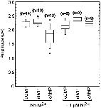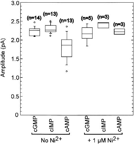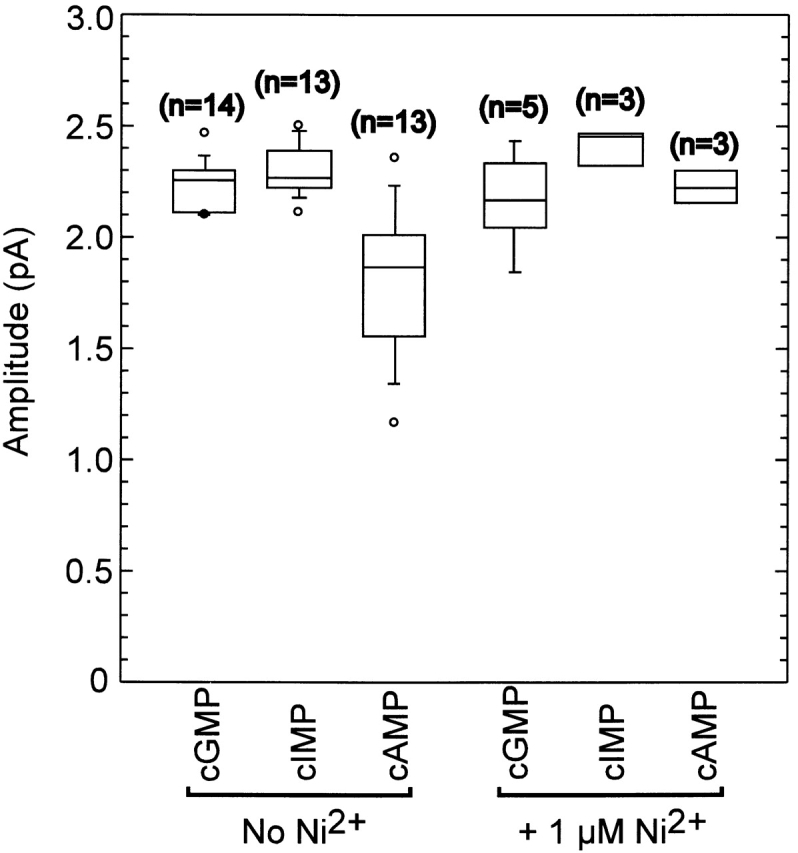 Figure 8. Single-channel amplitude variation across experiments. Box plots of the values for the single-channel amplitude as determined by fitting the sum of two Gaussians to inverse-filtered data. The horizontal line within each box indicates the median of the data; boxes show the 25th and 75th percentiles of the data; whiskers show the 5th and 95th percentiles. Extreme data points are also indicated. The median single-channel conductance was 2.25 pA for cGMP, 2.27 pA for cIMP, 1.87 pA for cAMP, 2.15 pA for cGMP with Ni2+, 2.46 pA for cIMP with Ni2+, and 2.21 pA for cAMP with Ni2+.