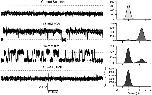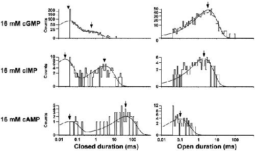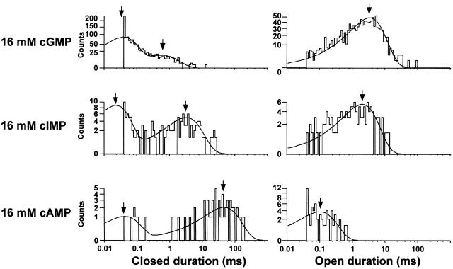 Figure 9. Half-amplitude threshold analysis indicates the presence of two closed and one open states. Closed (left) and open (right) duration histograms for single-channel data recorded with 16 mM cGMP, cIMP, or cAMP. Closed durations were fit to a double and open durations to a single exponential distribution. The time constants are indicated by the arrows. Parameters for the closed duration histograms were as follows: 16 mM cGMP: 1,118 events in histogram, τ(short) = 38 μs (weight, 0.85), τ(long) = 581 μs (weight, 0.15); 16 mM cIMP: 128 events in histogram, τ(short) = 24 μs (weight, 0.69), τ(long) = 4.21 ms (weight, 0.31); 16 mM cAMP: 58 events in histogram, τ(short) = 42 μs (weight, 0.34), τ(long) = 46.4 ms (weight, 0.66). Parameters for the open duration histograms were as follows: 16 mM cGMP: 1,118 events, τ = 3.42 ms; 16 mM cIMP:128 events, τ = 2.04 ms; 16 mM cAMP: 58 events, τ = 102 μs.