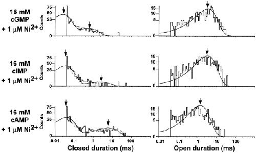 Figure 10. Half-amplitude threshold analysis of currents in the presence of Ni2+. Closed (left) and open (right) duration histograms for single-channel data recorded with 16 mM cGMP, cIMP, or cAMP, and 1 μM Ni2+. Closed durations were fit to a double and open durations to a single exponential distribution. The time constants are indicated by the arrows. Parameters for the closed duration histograms were as follows: 16 mM cGMP: 357 events in histogram, τ(short) = 36 μs (weight, 0.85), τ(long) = 548 μs (weight, 0.15); 16 mM cIMP: 407 events in histogram, τ(short) = 36 μs (weight, 0.96), τ(long) = 3.25 ms (weight, 0.04); 16 mM cAMP: 443 events in histogram, τ(short) = 40 μs (weight, 0.84), τ(long) = 6.3 ms (weight, 0.16). Parameters for the open duration histograms were as follows: 16 mM cGMP: 357 events, τ = 3.57 ms; 16 mM cIMP: 407 events, τ = 3.56 ms; 16 mM cAMP: 443 events, τ = 1.46 ms.
