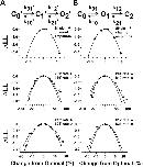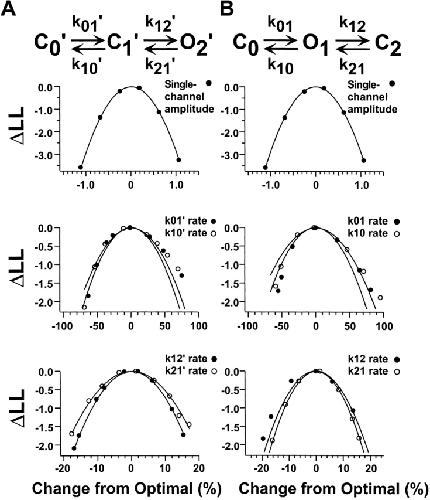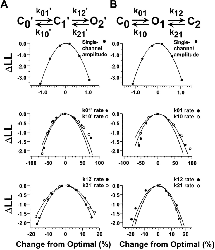 Figure 15. Errors in the determination of the rate constants and single-channel amplitude from HMM analysis. For this analysis, a 0.73-s segment (or 18,198 sample points) from a single-channel patch activated by cGMP was tested to determine the errors in the determination of the rate constants due to the method (see methods). The approach was applied separately for the (A) C0′ ↔ C1′ ↔ O2′ and (B) C ↔ O ↔ C schemes. The abscissa is the percent change in the value of the parameter away from the maximum-likelihood rate. The ordinate is the change in log likelihood from the maximum-likelihood value. The curves were fit by Eq. 1.