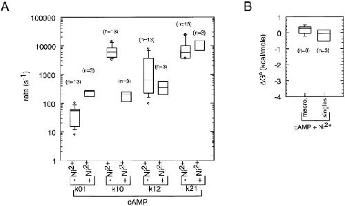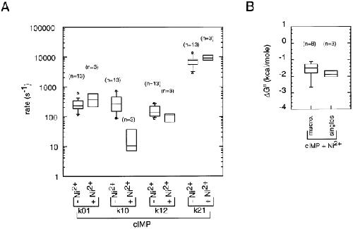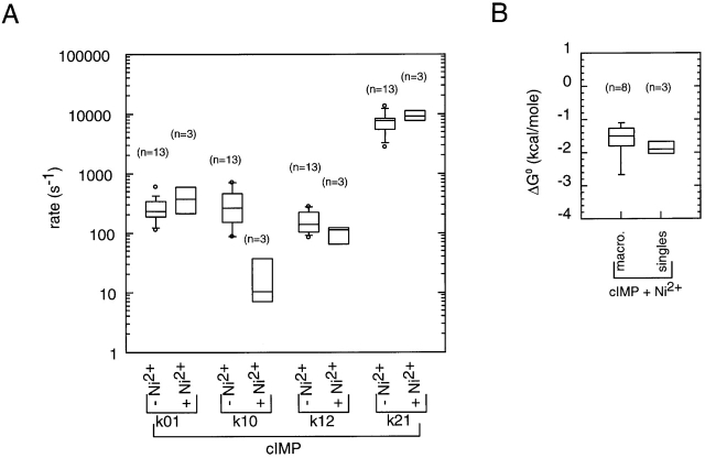 Figure 17. The effect of Ni2+ on HMM rate constants for cIMP. (A) Comparison of rate constants for cIMP with and without Ni2+. Values for the rate constants were determined by HMM analysis. The horizontal line within each box indicates the median of the data, boxes show the 25th and 75th percentiles of the data, and whiskers show the 5th and 95th percentiles. Extreme data points are also indicated. (B) Comparison of values for ΔG0 for activation by cIMP in the presence of Ni2+ between macroscopic and single-channel experiments.