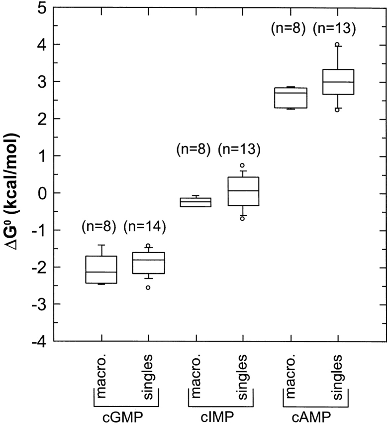 Figure 16. Box plot comparison between the values for ΔG0 from macroscopic and single-channel experiments. For macroscopic experiments, the free energy change of the allosteric transition ΔG0 was calculated as ΔG0 = −RT ln L, where L is the equilibrium constant and was calculated using Ni2+ potentiation. For the single-channel experiments, ΔG0 was calculated as ΔG0 = −RT ln k01/k10, where k01 and k10 are maximum-likelihood rate constants from the HMM analysis for the C0 ↔ O1 ↔ C2 model.