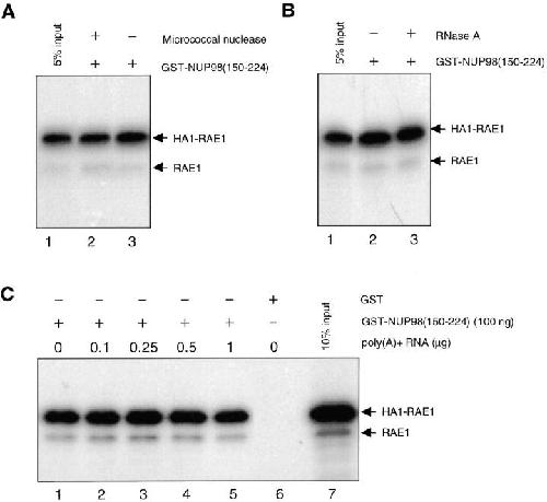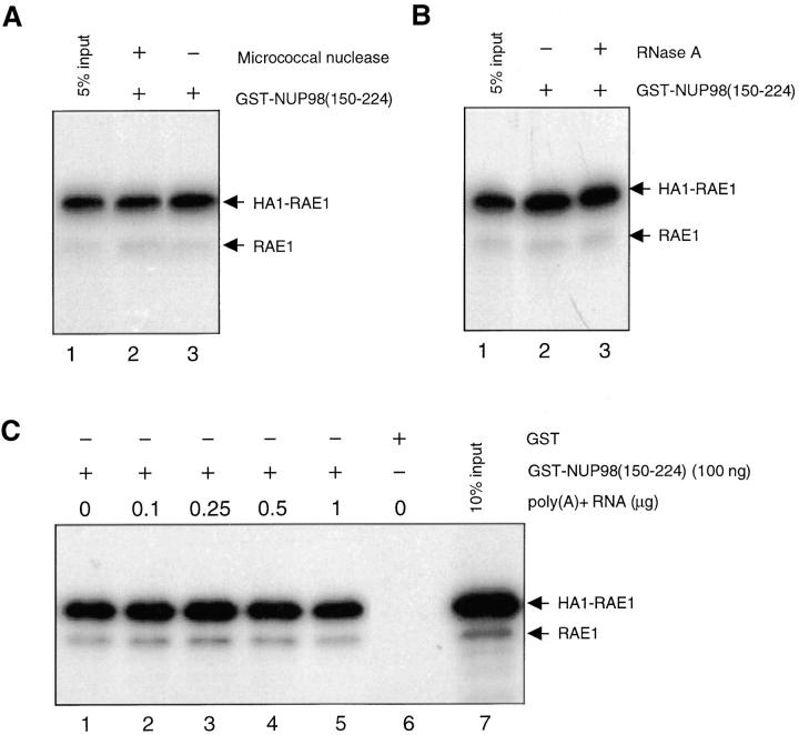 Figure 3. Poly(A)+ RNA is not a cofactor in the binding reaction between RAE1 and the GLEBS-like motif of NUP98 in vitro. (A) Pull-down assay performed with GST-NUP98(150– 224) fusion protein purified from E. coli and [35S]-methionine– labeled in vitro–translated HA1-RAE1 pretreated with or without Micrococcal nuclease. GST alone did not pull-down HA1-RAE1 (not shown). (B) As in A, but pretreated with or without RNase A. GST alone did not pull-down HA1-RAE1 (not shown). (C) Pull-down assay with GST-NUP98(150–224) and in vitro–translated HA1-RAE1 in the presence of various concentrations of poly(A)+ RNA isolated from HtTA cells. GST alone does not pull-down HA1-RAE1, as indicated in lane 6.