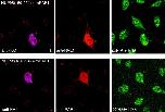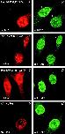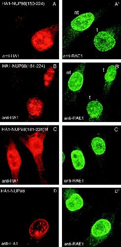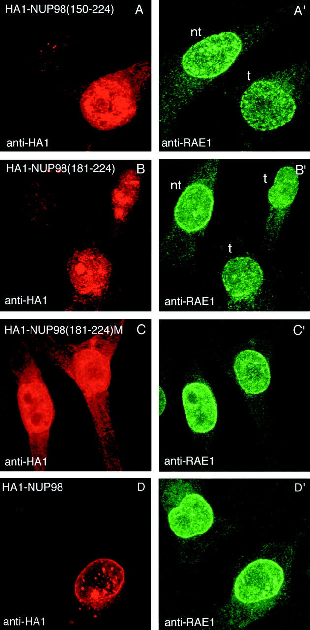 Figure 8. Overexpression of the GLEBS-like motif of NUP98 results in decreased levels of RAE1 at the NE. (A–D′ inclusive) Paired confocal images from HtTA cells that transiently express various forms of the GLEBS-like motif of NUP98. Cells were double-stained for HA1-tagged protein using the 12CA5 monoclonal antibody (left) and for RAE1 using affinity-purified RAE1 polyclonal rabbit antibodies. Cells shown in the confocal images are representative for results obtained in three to four independent experiments. High magnification images are given to illustrate detail. (A, A′, B, and B′) Overexpression of the GLEBS-like motif leads to a subtle but significant decrease in NE localization of RAE1. Compare NE staining of cells that do not overexpress the RAE1-binding (nt) and cells that do (t). (C, C′, D, and D′) Cells expressing a GLEBS-like motif mutant that is unable to interact with RAE1 or full-length NUP98 (D and D′) display an RAE1-distribution pattern comparable with that of wild-type HtTA cells.