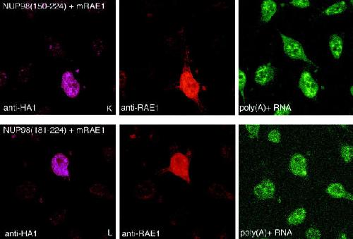 Figure 9. Overexpression of the GLEBS-like motif of NUP98 results in accumulation of poly(A)+ RNA in the nucleus. (A–J′, inclusive) Paired confocal images from HtTA cells that are transiently expressing HA1-NUP98 mutants. These cells were double stained for HA1-tagged protein by immunohistochemistry using the 12CA5 monoclonal antibody (left) and for poly(A)+ RNA by in situ hybridization using a FITC-labeled oligo-(dT) 50 mer (right). The identity of the HA1-tagged NUP98 mutants is indicated as the left of each pair. The poly(A)+ RNA accumulation in B′ appears more robust than that in C′, which represents a photographic rather than a real difference. The arrow in F′ points to one of the sites of preferred poly(A)+ RNA localization (also reported by Huang et al., 1994). K and L Show poly(A)+ distribution in HtTA cells overexpressing mouse RAE1 protein and, at the same time, HA1-NUP98(150–224) or HA1-NUP98(181–224). Each row of three images shows the same field of cells stained for either HA1-tagged protein (left), ectopically expressed mouse RAE1 and native human RAE1 (middle), and poly(A)+ RNA (right). Note that mouse RAE1 overexpression restores proper mRNA export in cells expressing various forms of the GLEBS-like motif. The combined anti–HA1/poly(A)+ staining procedure does not allow extensive blocking of nonspecific 12CA5 antibody binding. Therefore, nontransfected cells display higher levels of background staining than those shown in Fig. 7.