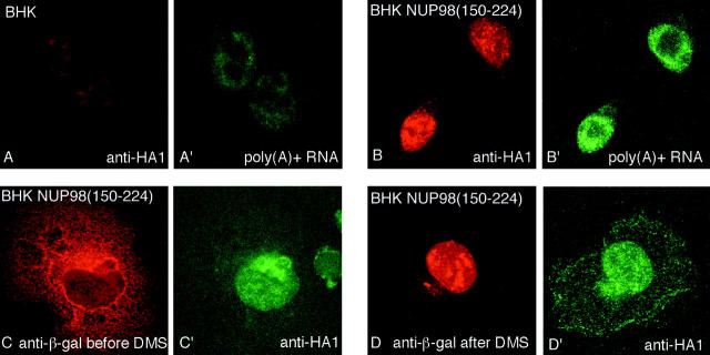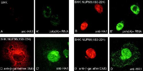 Figure 10. Overexpression of the GLEBS-like motif of NUP98 does not affect nuclear protein import. (A and B) Representative images of normal and HA1-NUP98(150–224)–expressing BHK cells stained with monoclonal antibody 12CA5 and the FITC-labeled oligo-(dT) 50 mer. Note that HA1-NUP98(150–224)–expressing BHK cells accumulate poly(A)+ RNA in their nuclei. (C and D) Immunofluorescence detection of the glucocorticoid receptor–β-galactosidase fusion protein in a representative BHKgrβ cell expressing HA1-NUP98(150–224) before and 30 min after the addition of 10 mg/ml dexamethasone (DMS).