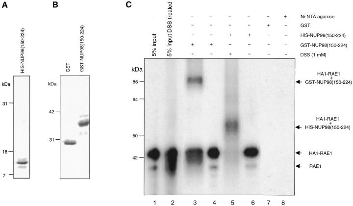 Figure 2. Chemical cross-linking of in vitro–translated HA1-RAE1 to E. coli–purified GLEBS-like motifs. (A) Purified recombinant HIS-NUP98(150–224) (∼11-kD) protein separated by SDS-PAGE (15% polyacrylamide gel) and detected by Coomassie brilliant blue (CBB; Bio-Rad Laboratories) staining. (B) Purified recombinant GST (29 kD) and GST-NUP98(150–224) (∼38 kD) protein run on a 10% polyacrylamide gel and stained with CBB. (C) Pull-down assays performed with [35S]-methionine–labeled HA1-RAE1 synthesized in vitro (45 kD), and GST- or HIS-NUP98(150–224) fusion proteins purified from E. coli. 5% input shows 5% of the labeled HA1-RAE1 protein used in each pull-down assay. Typically, the in vitro–translated RAE1 appears as a doublet, representing fragments with and without a HA1 tag (the RAE1 cDNA was cloned in pSP73 as a HA1 fusion gene that retained the endogenous RAE1 translation initiation codon). GST beads and Ni-NTA agarose acted as negative control for binding in GST-NUP98(150–224) and HIS-NUP98(150–224) pull-down assays, respectively. Comparable amounts of GST, GST-NUP98(150–224), and HIS-NUP98(150–224) proteins were used in each pull-down assay. The experiment shown is representative for two independent experiments. A cross-linked GST-NUP98(150–224)/RAE1 product of ∼84 kD and a cross-linked HIS-NUP98(150–224)/RAE1 product of ∼56 kD were obtained specifically in DSS-treated samples. Note that cross-linking of RAE1 to HIS-NUP98(150–224) was more efficient than to GST-NUP98(150–224). Molecular weight standards are indicated at right.
