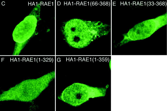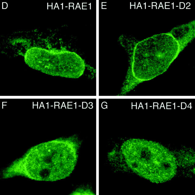 Figure 4. Multiple domains of RAE1 are necessary but not sufficient for interaction with NUP98. (A) Schematic representation of HA1-RAE1 deletion mutants. The four WD-repeat motifs are indicated as gray boxes. All mutants expressed an NH2-terminal HA1 tag. (B) Western blot analysis of proteins precipitated with 12CA5 antibody from lysates of HtTA cells transiently transfected with HA1-RAE1 or various deletion mutants. Precipitated proteins were visualized with 12CA5 (top) and anti–NUP98 antibodies (bottom). The HA1-RAE1 mutants used are indicated above the lanes. Molecular weight standards are indicated to the left. Results shown are representative for three independent experiments. (C–G) Confocal images detailing the subcellular distribution HA1-RAE1 deletion mutants moderately expressed in HtTA cells and stained with 12CA5 antibody. Note that the ability to coprecipitate NUP98 correlates with prominent NE staining.