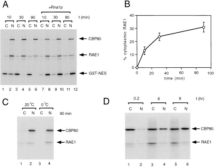 Figure 6. RAE1 shuttles between the nucleus and the cytoplasm. (A) A mixture of in vitro–translated [35S]-methionine–labeled CBP80, HA1-RAE1 (seen as a doublet that represents HA1-RAE1 and RAE1), and GTS-NES was injected into Xenopus laevis oocytes nuclei, either in the absence (lanes 1–6) or presence (lanes 7–12) of 80 μM Rna1p. After injection, oocytes were incubated at 20°C and protein samples from nuclear (N) and cytoplasmic (C) fractions were collected at 10, 30, or 90 min. Proteins were separated by SDS-PAGE and detected by fluorography. (B) Kinetics of RAE1 distribution after nuclear injection. Values were obtained from three experiments; error bars represent standard deviations. (C) Comparison of nuclear export of RAE1 at 20° (lanes 1 and 2) and 0°C (lanes 3 and 4). (D) Nuclear uptake of RAE1 after cytoplasmic injection after 0.2 (lanes 1 and 2), 6 (lanes 3 and 4), or 9 h (lanes 5 and 6).