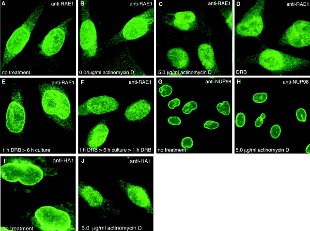 Figure 7. RAE1's association with the NE requires RNA polymerase II activity. (A–H) Images of HtTA cells stained for RAE1 or NUP98 after treatment with RNA polymerase inhibitors. RAE1-stained cells treated with (A) 0 μg/ml AMD for 1 h, (B) 0.04 μg/ml AMD for 1 h, (C) 5.0 μg/ml AMD for 1 h, (D) 50 μg/ml DRB for 1 h, (E) 50 μg/ml DRB for 1 h and cultured 6 h in the absence of DRB, and (F) 50 μg/ml DRB for 1 h, cultured 6 h without DRB, and finally treated again with 50 μg/ml DRB for 1 h. Images shown are representative for results obtained from three independent experiments. (G and H) Respective nontreated and 5.0 μg/ml AMD–treated HtTA cells stained with NUP98-specific antibodies. Note that NUP98 levels at the NE are not dependent on RNA polymerase II activity. (I and J) Effect of AMD treatment on HtTA cells that moderately express HA1-RAE1.