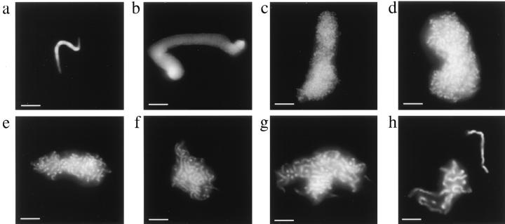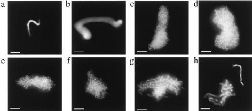 Figure 1. Structural changes of Xenopus sperm nuclei in mitotic egg extract; control sperm nuclei (a), decondensed sperm after 10 min of incubation in the extract (b), chromosomal structures (c–g) found after 30, 60, 90, 120, and 150 min, respectively. Upon 180 min of incubation (h) well-separated individual chromosomes were observed. Bars, 5 mm.