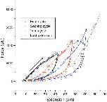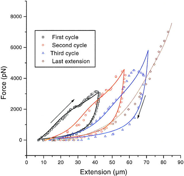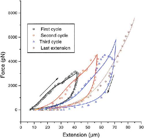 Figure 5. Force–extension cycles of a single chromosome (initial length 7 μm) for high deformations at 1 μm/s. The solid lines represent the numerical resolution of equations of 45 parallel titin-like molecules. 25% of the domains are supposed to be irreversibly unfolded after the first cycle, 40% after the second one, and 60% after the third one. The parameters used to solve the kinetic equations were: lunfold = 29 nm, lfold = 4 nm, A = 2 nm, Ea = 22 pN nm, Δx = 0.1 nm, Δx′ = 2 nm, ω0 = 1 s−1. The initial chain deformation, due to chromatin pressure, is taken as z/L = 0.5.