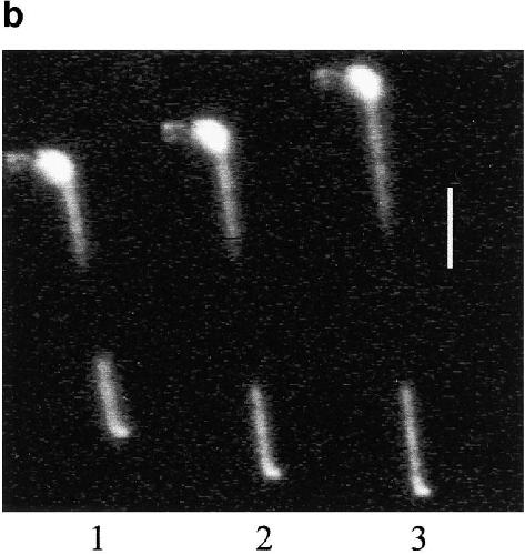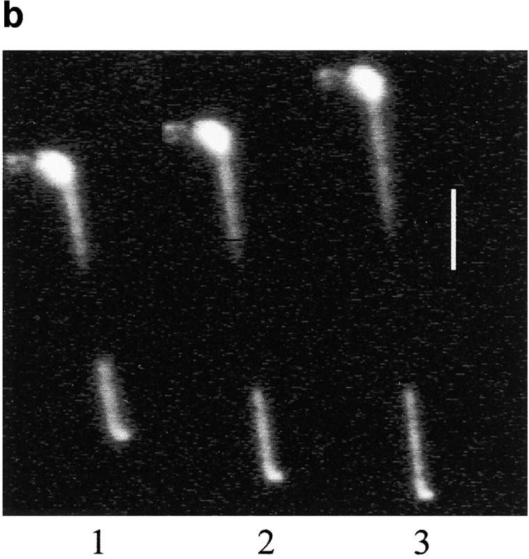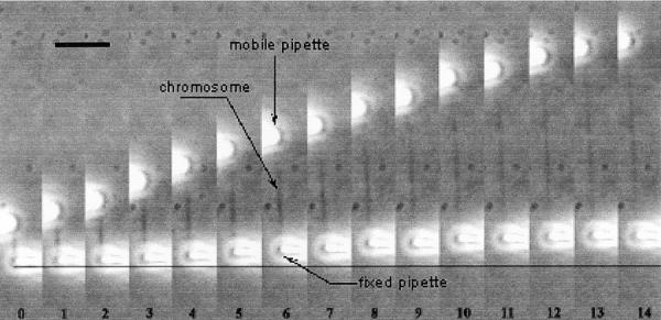 Figure 3. Successive micrographs of typical force–extension measurement. A chromosome was suspended between two micropipettes and stretched with the upper one. The lower micropipette (prepared in order to have K ≈ 2–4 × 10−4 N/m spring constant) was calibrated after each measurement. The length of the chromosome and the force applied to it were measured after digitization of the recorded images. Bar, 10 μm.