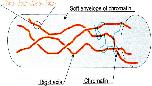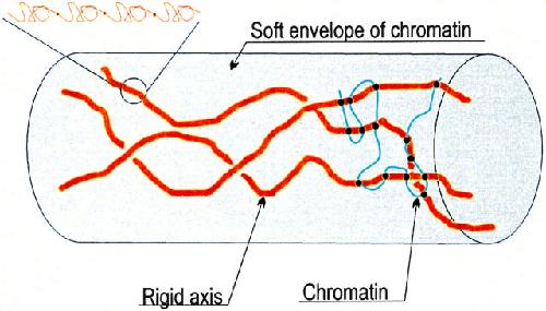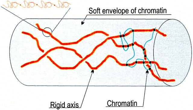 Figure 7. Schematic representation of mitotic chromosome structure based on elastic measurements. The chromosome is proposed to be formed of a few rigid axes, surrounded by a soft envelope of chromatin attached to the axes. The rigid axes are built of titin-like molecules, formed of repetitive domains, which can be unfolded upon application of force.