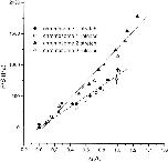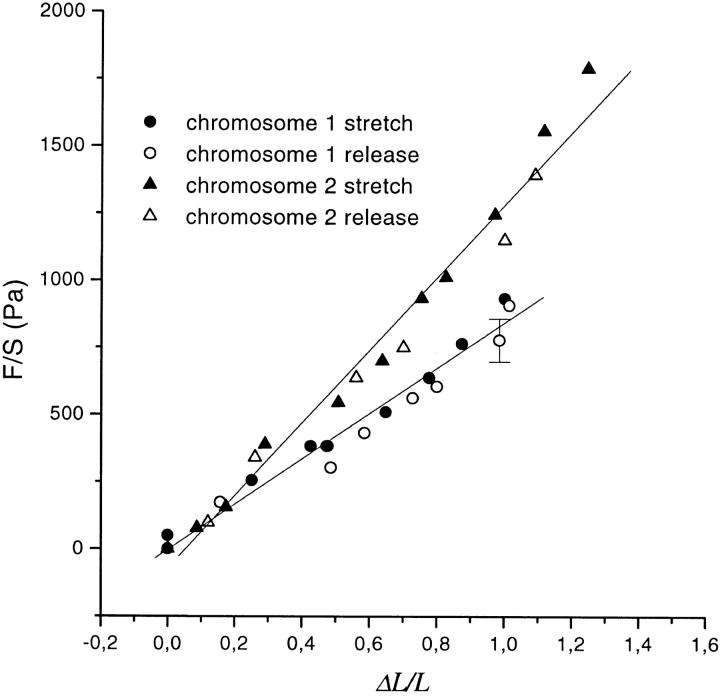 Figure 4. The force per section versus deformation curve for two different chromosomes. Y1 = 840; Y2 = 1,350. For simplicity, the error bar for one point only is shown. Chromosome diameter is 0.8 μm (section 0.5 μm2). The initial length of chromosome 1 was 9.5 μm, and that of chromosome 2 was 8.7 μm.