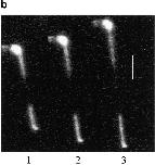 Figure 6. (a) Apparition of plateau regime before the breakdown of the chromosome for high extension regime (initial chromosome length: 7.8 μm). (b) If the extension is stopped at the middle of the plateau regime, domains of thick chromosome connected by thin filaments are observed. Three successive micrographs of a partially unraveled chromosome are shown, where one micropipette moves to show the existence of the connecting thin filament.