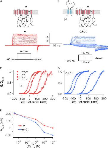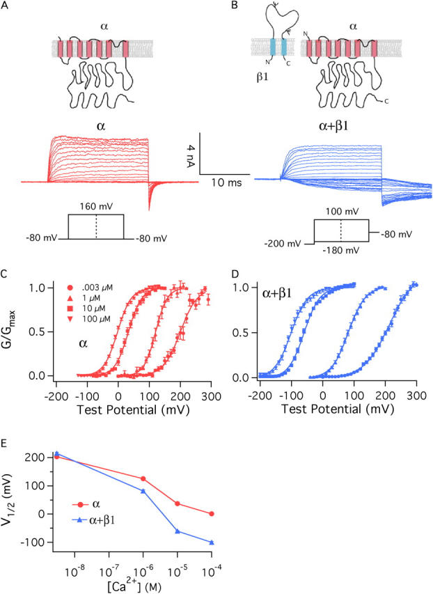 Figure 1. β1 increases the Ca2+ sensitivity of the BKCa channel. (A and B) Macroscopic currents recorded from BKα channels (A) and BKα+β1 channels (B). Currents are from inside-out Xenopus oocyte macropatches exposed to 10 μM internal Ca2+. (C and D) G–V relations determined at the following Ca2+ concentrations: 0.003, 1, 10, and 100 μM for the BKα channel (C) and BKα+β1 channel (D). Each curve represents the average of between 4 and 22 individual curves. Error bars indicate SEM. The solid curves are Boltzmann fits with the following parameters: BKα, 3 nM Ca2+: Q = 0.93 e, V1/2 = 200.3 mV; 1 μM Ca2+: Q = 1.36 e, V1/2 = 120.6 mV; 10 μM Ca2+: Q = 1.18 e, V1/2 = 32.8 mV; 100 μM Ca2+: Q = 1.15 e, V1/2 = −2.4 mV. BKα1β1, 3 nM Ca2+: Q = 0.62 e, V1/2 = 213.1 mV; 1 μM Ca2+: Q = 0.94 e, V1/2 = 82.1 mV; 10 μM Ca2+: Q = 1.02 e, V1/2 = −59.5 mV; 100 μM Ca2+: Q = 0.96 e, V1/2 = −101 mV. (E) Plots of half-maximal activation voltage (V1/2) vs. Ca2+ concentration. The V1/2 values are from Table I. Error bars represent SEM.
