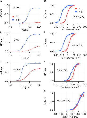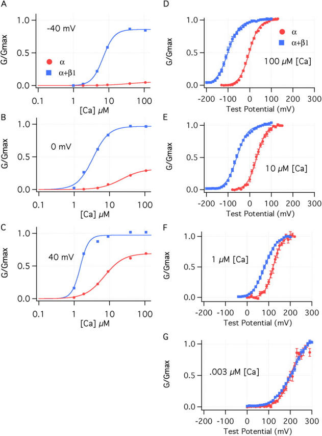 Figure 2. The effects of β1 are both Ca2+ and voltage dependent. (A–C) Ca2+ dose–response curves determined for the BKα and BKα+β1 channel at (A) −40, (B) 0, and (C) +40 mV. Curves are fitted with the hill equation:.Fit parameters are as follows: −40 mV, BKα (Kd = 36.5 μM, n = 1.24); BKα+β1(Kd = 6.89 μM, n = 2.7); 0 mV, BKα (Kd = 22.1 μM, n = 1.5); BKα+β1 (Kd = 3.4 μM, n = 1.9); +40 mV, BKα (Kd = 7.25 μM, n = 1.6); BKα+β1(Kd = 3.68 μM, n = 1.5). (D–G) G–V relations are shown for the BKα and the BKα+β1 channel at (D) 100 μM Ca2+, (E) 10 μM Ca2+, (F) 1 μM Ca2+, and (G) 3 nM Ca2+. The curves are fitted with Boltzmann functions as described in the legend to Fig. 1.