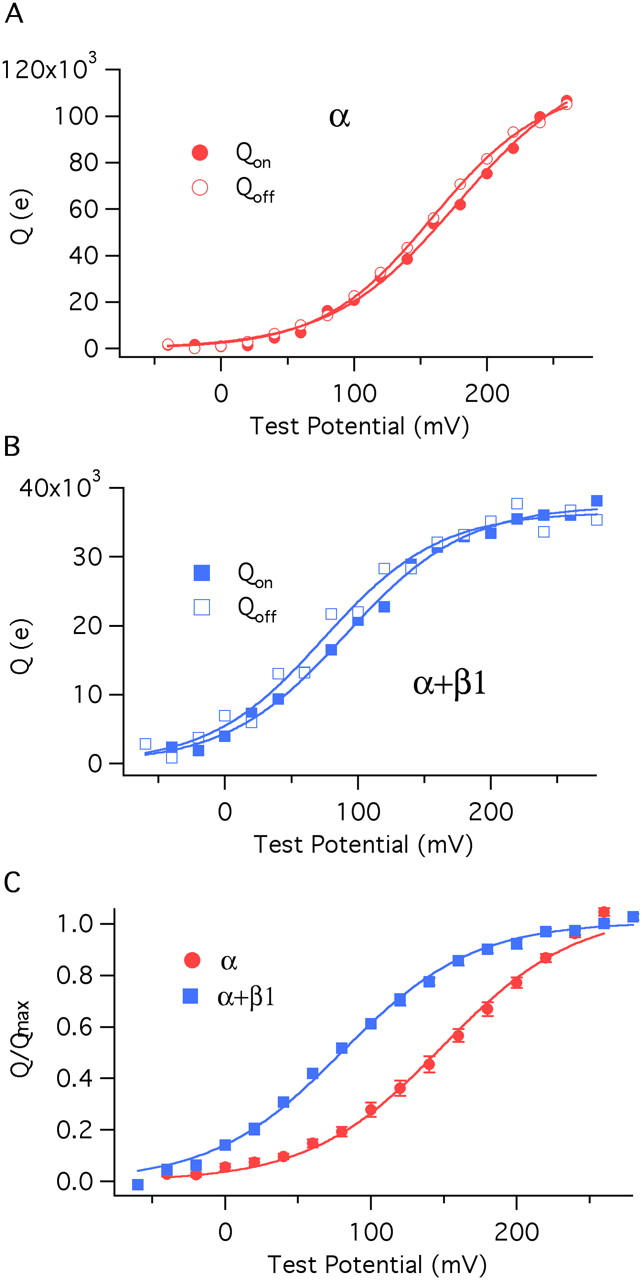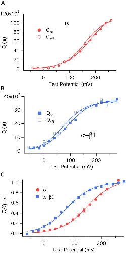 Figure 4. The β1 subunit shifts the closed channel's charge–voltage (Q–V) relation leftward without changing its shape. (A) On and Off Q–V relations determined from a single BKα channel patch. (B) On and Off Q–V relations determined from a single BKα+β1 channel patch. (C) Normalized averaged Qon–V relations for the BKα (11 curves averaged) and BKα+β1 channels (14 curves averaged). Each curve in C is fitted with a Boltzmann function. The fit parameters are as follows: BKα: zJ = 0.577 ± 0.023e, Vhc = 151 ± 1.9 mV; BKα+β1: zJ = 0.571 ± 0.025 e, Vhc = 80 ± 2.4 mV. The error bars in C represent SEM.