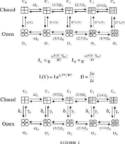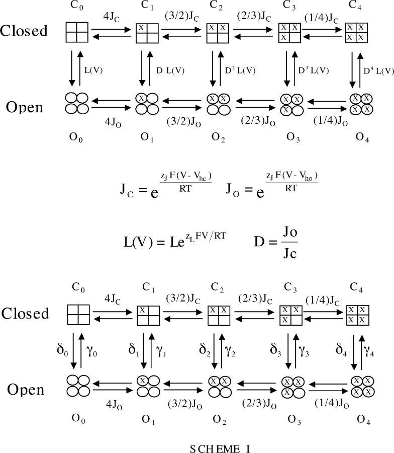 Figure 5. The allosteric model of BKCa voltage-dependent gating of Horrigan et al. (1999). Horizontal transitions represent voltage senor movement. Vertical transitions represent channel opening. For details of the model see RESULTS and MATERIALS AND METHODS.
