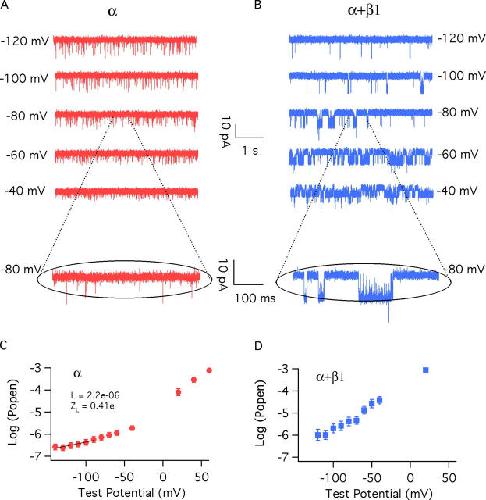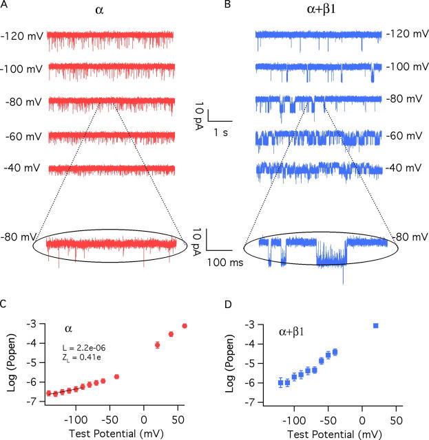 Figure 6. Estimating L and zL from Popen at negative voltages. Unitary currents were recorded with 3 nM internal Ca2+ from BKα (A) and BKα+β1(B) channels. The patch in A contained 2,859 channels. The patch in B contained 3,270 channels. Mean log(Popen)–voltage relations determined from patches like that in A (12 patches) and B (15 patches) are shown in C for the BKα channel and D for the BKα+β1 channel. In C, the bottom of the curve is fitted with the following function: log(Popen) = log(L) + 0.4342zLFV/RT. The resulting parameters were log(L) = −5.66 ± 0.13, zL = 0.410 ± 0.065. In D, no submaximal limiting slope was identified.