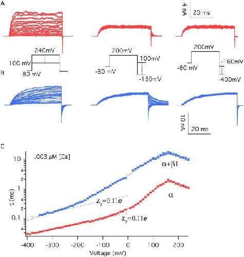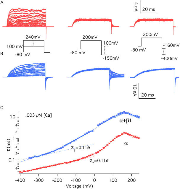 Figure 7. The β1 subunit does not alter the voltage dependence of the closed-to-open conformational change. Macroscopic ionic currents were recorded from BKα (A) and BKα+β1 (B) channels in excised oocyte macropatches. Voltage steps were varied as indicated, and the time courses of relaxation were fitted with single-exponential functions. Time constants (τ) from the fits are plotted in C. For voltages of +100 mV and greater, activation time constants are plotted. Otherwise deactivation time courses are plotted. The τ–V curves in C were fitted (solid lines) to a function that approximates the kinetics of Scheme I in the limit that voltage sensor movement is fast relative to channel opening and closing (see MATERIALS AND METHODS). The fit parameters were as follows: BKα: held Vhc=151 mV, L = 2.2 × 10−6, zJ = 0.58 e, zL = 0.41 e, fitting yielded D = 12.6 ± 0.43, zγ = 0.10 ± 0.002 e, γ0(0) = 7452.3 s−1, γ1(0) = 4121.4 s−1, γ2(0) = 5645.8 s−1, γ3(0) = 851 s−1, γ4(0) = 1025 s−1, δ0(0) = 0.016 s−1, δ1(0) = 0.114 s−1, δ2(0) = 1.98 s−1, δ3(0) = 3.76 s−1, δ4(0) = 57.12 s−1; BKα+β1: held Vhc = 80 mV, zJ = 0.57 e, fitting yielded L = 3.3 × 10−6 ± 6.4 × 10−6, zL = 0.46 e, D = 10.4 ± 6.4, zγ = 0.17 e, γ0(0) = 931.7 s−1, γ1(0) = 213.2 s−1, γ2(0) = 547.8 s−1, γ3(0) = 333.5 s−1, γ4(0) = 126.7 s−1; δ0(0) = 0.003 s−1, δ1(0) = 0.007 s−1, δ2(0) = 0.198 s−1, δ3(0) = 1.251 s−1, δ4(0) = 4.934 s−1. Both curves are also fitted (dashed lines) at far negative voltages with the following function:τ=.Fit parameters are as follows: BKα (voltages <−180 mV) γ(0) = 6940.8 s−1, z = 0.11 e; BKα+β1 (voltages <−280 mV) γ(0) = 1808.7 s−1, zγ = 0.11 e.