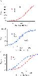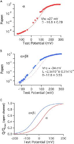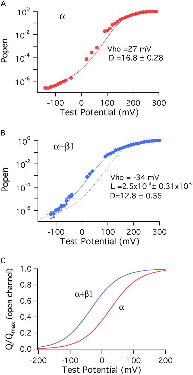 Figure 8. Estimating L and Vho from Popen–V curve fits. (A) The Po–V relation of the BKα channel at 3 nM Ca2+ is shown over a wide range of voltages. At +60 mV and below, the data points are from unitary current measurements; above +60 mV, the data are from macroscopic current measurements. The curve displayed represents the average of 35 experiments, and error bars represent SEM. The data are fitted with Eq. 9 as described in RESULTS. Free parameters: D = 16.8 ± 0.28. (B) The Po–V relation of the BKα+β1 channel. The curve displayed represents the average of 43 experiments, and error bars represent SEM. As in A, the data are fitted with Eq. 9. Free parameters: D = 12.8 ± 0.55, L = 2.53 × 10−6 ± 0.55 × 10−6. The dashed red curve is the fit from A placed here for ease of comparison. (C) Simulated Q–V relations for the open BKα and BKα+β1 channels demonstrating the −61 mV shift induced by β1 that the fits in A and B predict. The functions displayed are,with Vho equal to 27 mV (BKα) and −34 mV (BKα+β1) and zJ = 0.58 (BKα), zJ = 0.57 (BKα+β1).