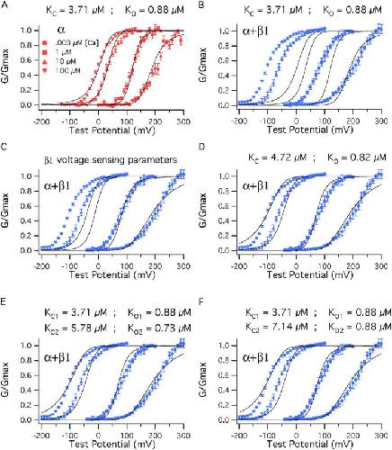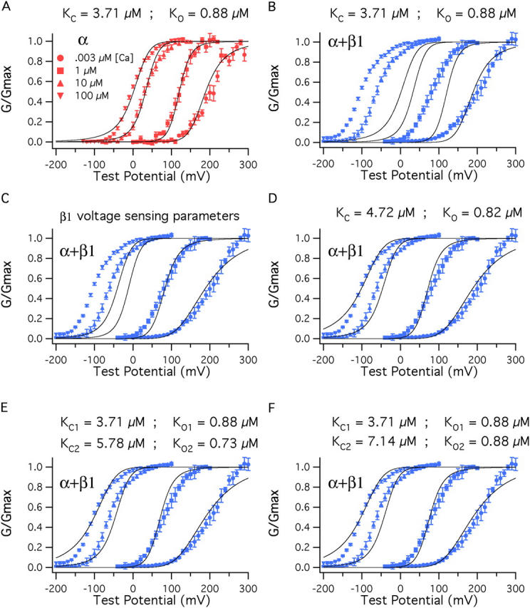 Figure 9. β1 also affects Ca2+ binding. (A) BKα G–V relations at a series of Ca2+ concentrations fitted simultaneously (solid curves) with Eq. 14. Only KC and KO were allowed to vary. The fit yielded KC = 3.71 μM and KO = 0.88 μM. The other parameters of the fit were determined from experiments performed with nominally 0 Ca2+ (3 nM) (Vhc = 151 mV, L = 2.2 × 10−6, Vho = 27 mV, zJ = 0.58, zL = 0.41). (B) The fit from A is superimposed on a series of BKα+β1 G–V curves. (C) The voltage-sensing parameters of the model were altered to reflect the changes that occur as β1 binds, Vho = (27→−34 mV), Vhc = (151→80 mV), L = (2.2 × 10−6→2.5 × 10−6). (D) With BKα+β1 voltage-sensing parameters KC and KO were allowed to vary freely, yielding the fit shown and KC = 4.72 μM, KO = 0.82 μM. (E) Here, the BKα+β1 voltage-sensing parameters were used for the fit, and β1 was allowed to influence only half of the channels' eight Ca2+-binding sites. The data are fit with Eq. 13. KC1 and KO1 were held at 3.71 μM and 0.88 μM, respectively. KC2 and KO2 were allowed to vary freely, yielding KC2 = 5.78 μM, KO2 = 0.73 μM. (F) The data are again fit with Eq. 13 but now KO2 was held at 0.88 μM and only KC2 was allowed to vary. This yielded KC2 = 7.14 μM.