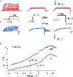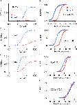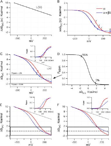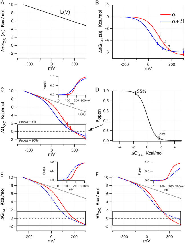 Figure 10. Examining the effects of β1 in energetic terms. (A) Plot of the sum of terms 3 and 4 from Eq. 15. (B) Plots of term 2 from Eq. 15 using either the BKα (red) or BKα+β1 (blue) voltage-sensing parameters (Table II). (C) Plots for both channels of terms 2, 3, and 4 of Eq. 15 combined. In the inset are drawn simulated Popen–V curves for the BKα and BKα+β1 channels based on the parameters in Table II and assuming 0 Ca2+. The boxed region indicates the energy range over which Popen moves from 0.05 (top of box) to 0.95 (bottom of box). A full Popen vs. ΔGO−C is shown in D. In E, a plot is shown like that in C except that Vho for the BKα+β1 channel has been set to −44 mV such that Vhc and Vho shift equally upon β1 coexpression. (F) Here Vho for the BKα+β1 channel has been set to −20 mV to mimic a larger change in the coupling factor D upon β1 coexpression.