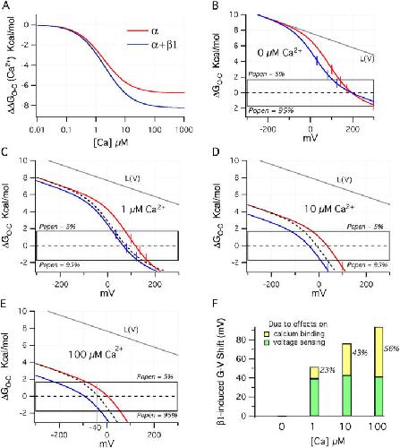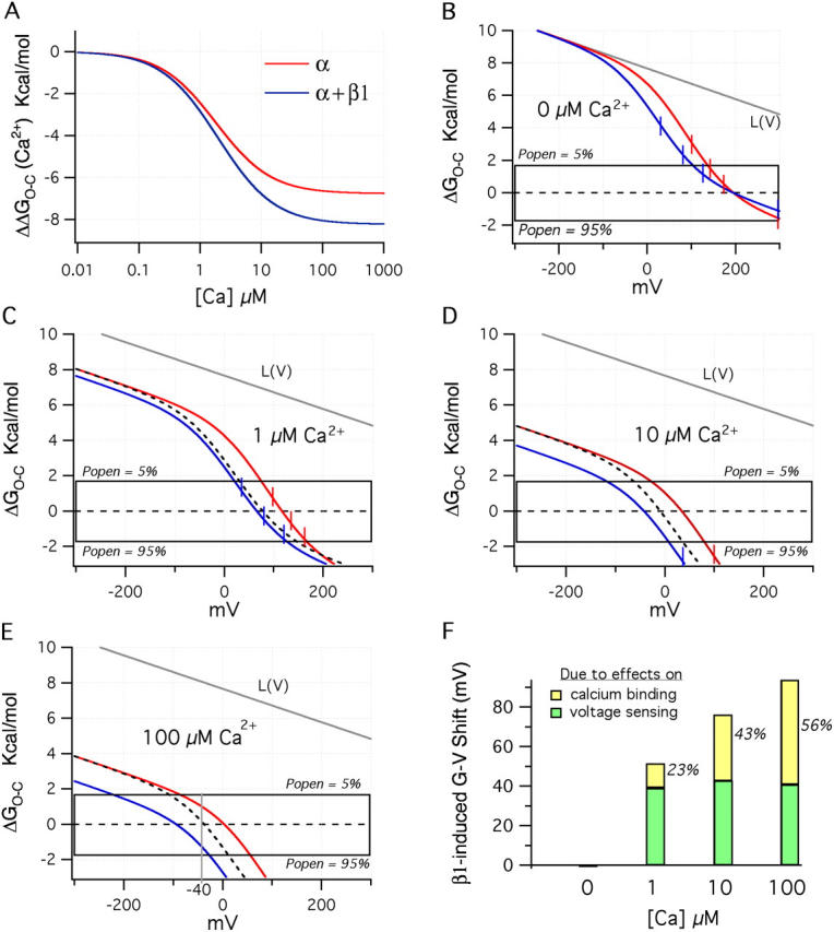 Figure 11. Ca2+ shifts the ΔGO−C–V relations to lower energies. (A) Plot of ΔGO−C vs. Ca2+ concentration for the BKα (red) and BKα+β1(blue) channels using the Ca2+ binding parameters determined from Fig. 11 (A and D). The plots were calculated using term 1 of Eq. 15. (B) As in Fig. 10 C, plotted here are the two model channel's ΔGO−C–V relations in the absence of Ca2+. (C) The same relations now with 1 μM Ca2+, (D) 10 μM Ca2+, and (E) 100 μM Ca2+. The dashed lines in C, D, and E indicate the BKα+β1 curve that would be observed, if there were no changes in Ca2+ bindng upon β1 coexpression. (F) Plotted are the total V1/2 shifts predicted by the BKα and BKα+β1 model channels upon β1 coexpression at 0, 1, 10, and 100 μM Ca2+. In green is the percent of the total shift due to changes in voltage sensing, and in yellow is the percentage due to changes in Ca2+ binding.