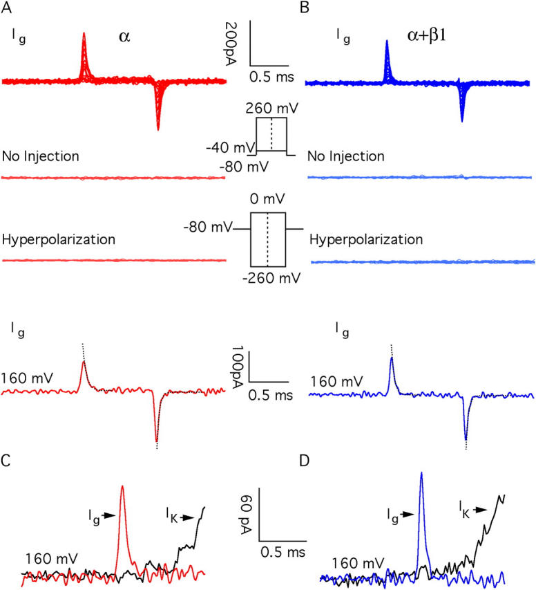 Figure 3. BKCa gating currents. (Top traces) Gating current families recorded from BKα (A) and BKα+β1 (B) channels with 0.5 nM internal Ca2+. The second and third traces in A and B demonstrate that gating currents are not observed in patches from oocytes that were not injected with BKCa cRNA (second) or with hyperpolarizing voltage steps (third). The lowest traces in A and B are gating currents recorded with pulses to +160 mV. Repolarizations are to −80 mV. Exponential fits to the on and off currents are indicated with dashed line. (C and D) Comparisons of on-gating current (Ig) and potassium current (IK) from BKα (C) and BKα+β1 (D) channels. Pulses were to +160 mV. Ca2+ = 0.5 nM. The gating and ionic currents compared in C and D are from different patches.