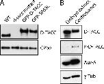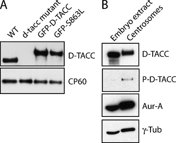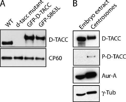 Figure 2. Western blot analysis of GFP–D-TACC and GFP-S863L expression and of the association of P–D-TACC with centrosomes. (A) A Western blot probed with anti–D-TACC antibodies. First lane, wild-type (WT) embryos; second lane, d-tacc mutant embryos; third lane, d-tacc mutant embryos expressing GFP–D-TACC; fourth lane, d-tacc mutant embryos expressing GFP-S863L. The same blot was reprobed with antibodies against the centrosomal protein CP60 as a loading control. (B) Western blots of whole embryo extracts (first lane) and purified centrosomes (second lane) probed with anti–D-TACC, -P–D-TACC, –Aurora A, and –γ-tubulin antibodies.