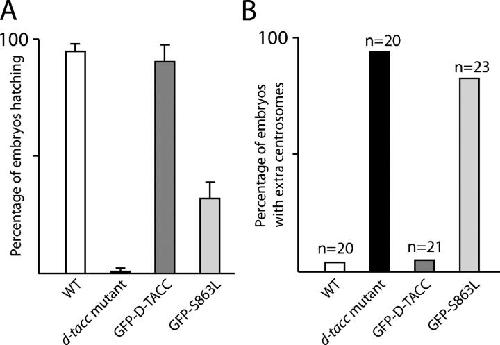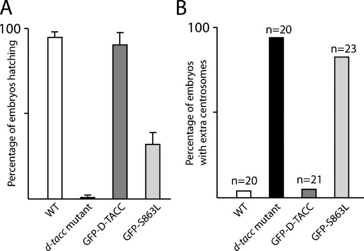 Figure 3. Quantitation of viability and mitotic defects in GFP–D-TACC and GFP-S863L embryos. (A) A bar chart showing the percentage of embryos that hatch from the following genotypes: wild-type (WT), d-tacc mutant, d-tacc mutant expressing GFP–D-TACC, and d-tacc mutant expressing GFP-S863L. Error bars represent SD. (B) A bar chart showing the percentage of embryos with extra centrosomes at nuclear cycle 14 (indicative of mitotic errors during earlier rounds of nuclear division; Raff, 2003). Numbers at the top of each bar are the number of embryos that were counted.