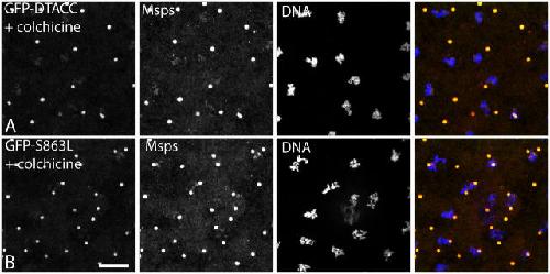 Figure 5. The distribution of Msps and GFP–D-TACC or GFP-S863L in embryos treated with colchicine. (A) A GFP–D-TACC (green in merged image) embryo treated with colchicine to depolymerize MTs. The distribution of Msps (red in merged image) and DNA (blue in merged image) are also shown. (B) A GFP-S863L embryo treated with colchicine, labeled as in A. Bar, 10 μm.