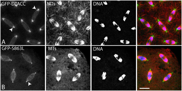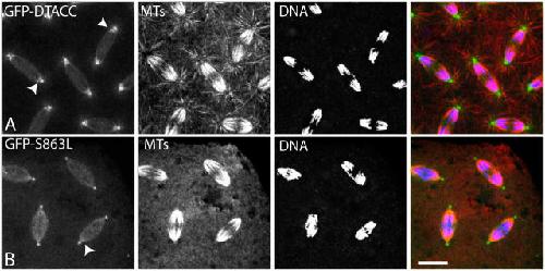 Figure 6. The distribution of MTs in GFP–D-TACC and GFP-S863L embryos. The distribution of MTs (red in merged images) and GFP–D-TACC or GFP-S863L (green in merged images) is shown in GFP–D-TACC (A) and GFP-S863L (B) embryos during anaphase. Arrowheads indicate the position of GFP–D-TACC binding to the minus ends of spindle MTs. This is not detectable in GFP-S863L embryos. DNA is shown in blue in the merged images. Bar, 10 μm.