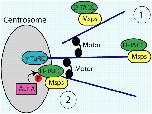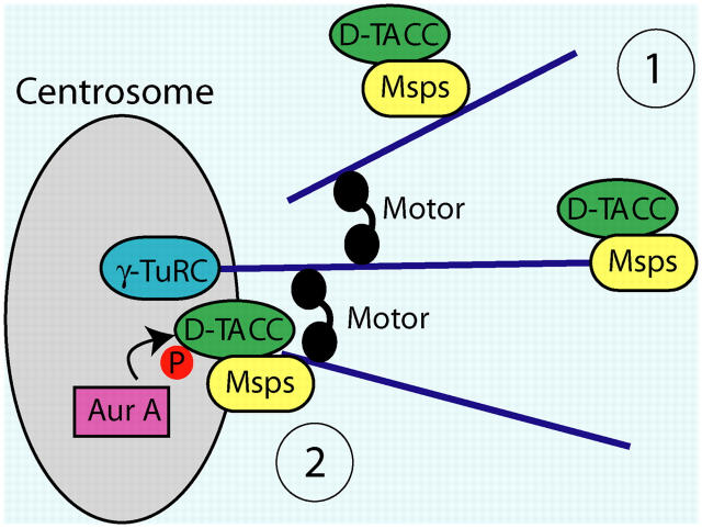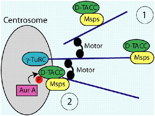 Figure 7. A schematic model of how the D-TACC–Msps complex stabilizes MTs in D. melanogaster embryos. MTs are nucleated at centrosomes by the γ-tubulin ring complex (γ-TuRC). These MTs are often released from γ-TuRC but are held in the vicinity of the centrosome by the action of MT motors. The bulk of D-TACC–Msps complexes (that are present at centrosomes, along MTs, and throughout the cytoplasm) can bind these MTs either laterally or at plus ends and stabilize them (mechanism 1). Aurora A can specifically activate a small fraction of D-TACC–Msps complexes that are at the centrosome. This allows the phosphorylated complexes (P, red) to interact with and stabilize MT minus ends (mechanism 2). Importantly, this mechanism is only active at centrosomes, and any MTs that form in the cytoplasm will not be stabilized in this way. This may explain, at least in part, why centrosomes are such dominant sites of MT assembly in mitosis.