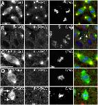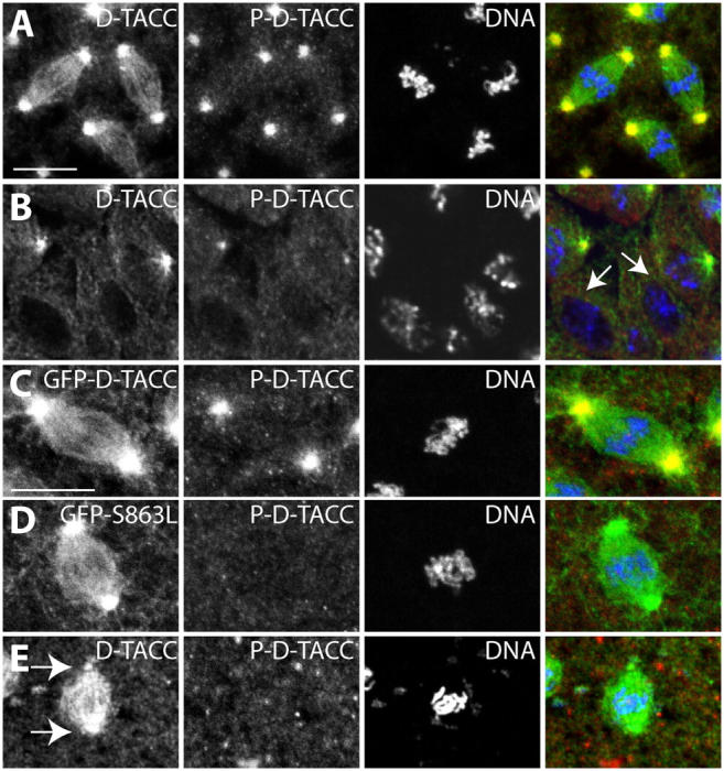 Figure 1. P–D-TACC is concentrated at centrosomes during mitosis. (A and B) The distribution of D-TACC, P–D-TACC, and DNA (green, red, and blue in merged image, respectively) in a wild-type syncytial embryo (A) and a wild-type cellularized embryo (B). D-TACC and P–D-TACC are not detectable at centrosomes in interphase cells in cellularized embryos (interphase cells are indicated by arrows). Note that only a single centrosome from each mitotic cell is present in the focal planes shown. (C) The distribution of GFP–D-TACC, P–D-TACC, and DNA in a d-tacc mutant embryo that has no endogenous D-TACC. GFP–D-TACC is concentrated at centrosomes and spindles, whereas P–D-TACC is concentrated at centrosomes. (D) The distribution of GFP-S863L, P–D-TACC, and DNA in a d-tacc mutant embryo. P–D-TACC is no longer detectable at centrosomes. (E) The distribution of D-TACC, P–D-TACC, and DNA in aur1 mutant embryos. D-TACC is weakly detectable at centrosomes but P–D-TACC is not. Bar, 10 μm.