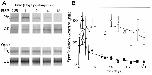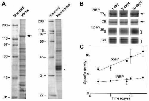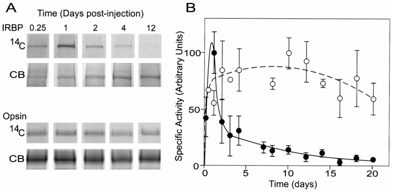 The interphotoreceptor matrix (IPM) is a highly-organized extracellular matrix critical to retinal development and function. Although the concentrations of its components are carefully regulated, little is known about the mechanisms of this regulation. Interphotoreceptor retinoid-binding protein (IRBP) is the most abundant soluble protein component of the IPM. Although its rate of clearance is thought to be an important factor regulating the concentration of IRBP within the IPM, no study has measured the rate of its extracellular turnover. Here we determine the rate of turnover of matrix IRBP in Xenopus. The rate of IRBP turnover was estimated by measuring the loss of radioactivity from protein labeled by a single injection of a radiolabeled protein precursor. To provide an estimate of the rate of IRBP turnover, we have examined the following issues: (1) Quantitative extraction of IRBP from the IPM for biochemical analysis. (2) Routes of delivery of radiolabeled precursor to achieve a pulse label in vivo. (3) Selection of labeled precursor in order to minimize reutilization of radiolabel. Using Western blot analysis, immunoprecipitation and immuno-electron microscopy, we found that IRBP can be quantitatively extracted from the IPM by a simple saline wash. IRBP was radiolabeled by systemic or intravitreal injection of either [35S]methionine or carboxyl-terminal labeled [1-14C]leucine. The specific activity of matrix IRBP was determined by either phosphorimaging or fluorography of Coomassie blue-stained SDS-polyacrylamide gels. Intravitreal injection of tracer was more effective than systemic delivery in achieving a pulse of radiolabel to the retina. This may be due to intravitreal injection allowing the body to act as a 'sink' for radiolabeled amino acid. When radiolabeled precursor was delivered by intravitreal injection, the calculated half-life of matrix IRBP using [35S]methionine was 25. 6+/-0.82 hr; in contrast, it was 10.7+/-2.9 hr using [1-14C]leucine. The faster apparent IRBP turnover using [1-14C]leucine is interpreted in context of the early decarboxylation of leucine during its degradation. Our results demonstrate rapid turnover of IRBP in the Xenopus IPM in vivo and suggest that the IPM is a dynamic structure undergoing continuous renewal.