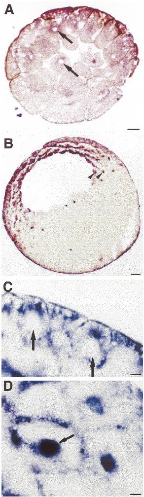 Fig. 3. ER1 is concentrated in the nucleus of marginal zone cells in stage 8 blastulae. Embryos were fixed at stages 6.5 (A) or 8 (B), sectioned and stained with anti-ER1. (A) The nuclei (arrows) remain unstained in early cleavage stages. (B) At stage 8, the nuclei (arrows in B and D) in the marginal zone begin to stain for ER1 while nuclei in the endoderm (B) as well as nuclei (arrows in C) in the rest of the animal hemisphere remain unstained. Bars = 0.1 mm in A,B and 0.02 mm in C,D.