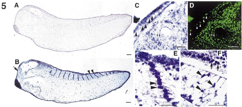 Fig. 5. ER1 begins to disappear from the nucleus in the epidermis and brain during tailbud stages. Embryos were fixed at stage 27, sectioned and stained with either pre-immune (A) or anti-ER1 (B-F). At stage 27, nuclei are stained in the endoderm (B), somites (arrows in B and E), notochord (arrows in F) as well as in most of the spinal cord (tailed arrows in F). Many of the nuclei in the brain (tailed arrows in B) and epidermis (arrows in C,D) are no longer stained, as illustrated by comparing the anti-ER1 stained epidermis and brain in (C) with the same section incu- bated with a fluorescent nuclear stain (D). The black arrows in (C) mark the position of the nuclei identified by white arrows in (D). Bars = 0.1 mm.