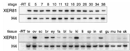 Fig. 2. XER81 mRNA levels during Xenopus embryogenesis and in adult tissues. RT-PCR reactions were performed with RNA preparations from staged