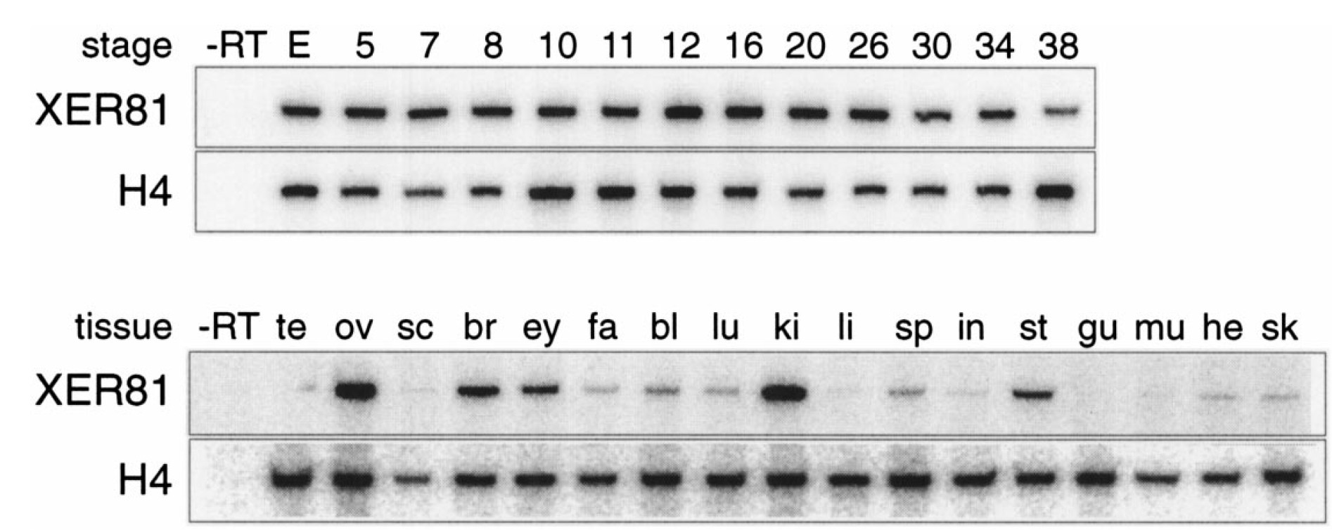embryos (upper) and from adult organs and tissues (lower) making use of primers specific for either XER81 or histone H4. Abbreviations: bl, bladder; br,