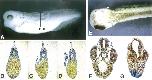 Fig. 6. Overexpression of XER81 induces the formation of tail-like protrusions and inhibits eye development in Xenopus embryos. (A) Tadpole stage Xenopus embryo that had been injected with XER81 encoding mRNA into two ventral blastomeres at the four cell stage and exhibits formation of a tail-like protrusion. (B,D) A series of transverse sections from a region of the tadpole indicated in panel (A). Sections were stained with aniline blue and orange G, allowing distinction of neural mesodermal and endodermal cells. (E) Tadpole stage Xenopus embryo that had been injected with XER81 encoding mRNA into two dorsal blastomeres at the four cell stage and exhibits inhibition of eye development. (F,G) Transverse sections at the level of the eye with a control embryo (F) and an embryo that had been injected with XER81 encoding mRNA into both blastomeres at the two cell stage (G).