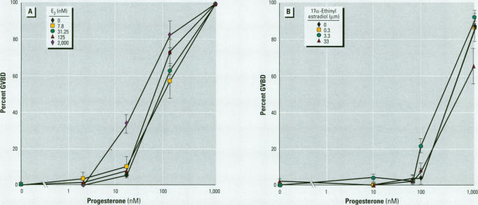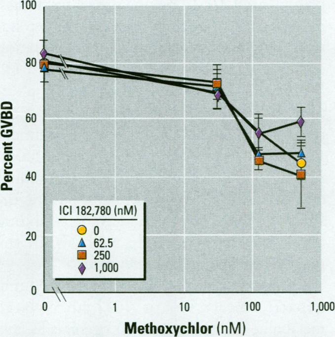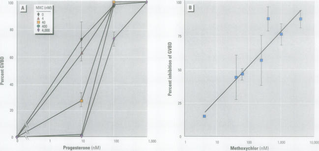 There is currently little evidence of pollution-induced endocrine dysfunction in amphibia, in spite of widespread concern over global declines in this ecologically diverse group. Data regarding the potential effects of endocrine-disrupting contaminants (EDCs) on reproductive function in amphibia are particularly lacking. We hypothesized that estrogenic EDCs may disrupt progesterone-induced oocyte maturation in the adult amphibian ovary, and tested this with an in vitro germinal vesicle breakdown assay using defolliculated oocytes from the African clawed frog, Xenopus laevis. While a variety of natural and synthetic estrogens and xenoestrogens were inactive in this system, the proestrogenic pesticide methoxychlor was a surprisingly potent inhibitor of progesterone-induced oocyte maturation (median inhibitive concentration, 72 nM). This inhibitory activity was specific to methoxychlor, rather than to its estrogenic contaminants or metabolites, and was not antagonized by the estrogen receptor antagonist ICI 182,780, suggesting that this activity is not estrogenic per se. The inhibitory activity of methoxychlor was dose dependent, reversible, and early acting. However, washout was unable to reverse the effect of short methoxychlor exposure, and methoxychlor did not competitively displace [3H]progesterone from a specific binding site in the oocyteplasma membrane. Therefore, methoxychlor may exert its action not directly at the site of progesterone action, but downstream on early events in maturational signaling, although the precise mechanism of action is unclear. The activity of methoxychlor in this system indicates that xenobiotics may exert endocrine-disrupting effects through interference with progestin-regulated processes and through mechanisms other than receptor antagonism.