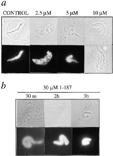 Figure 3. Inhibition of nuclear assembly by human LAP2 fragment 1–187. (a) Nuclei assembled for 3 h in reactions containing the indicated concentration of fragment 1–187. Upper panels show phase-contrast images; lower panels show DNA as visualized by Hoechst, except the right-most panel which shows a second phase-contrast image of a nucleus inhibited by 10 μM fragment 1–187. (b) Nuclei were assembled in a reaction containing 30 μM fragment 1–187 for the indicated times. Membrane association with chromatin is delayed, but after 3 h the nuclei appear similar to those arrested by 5–10 μM fragment 1–187.