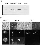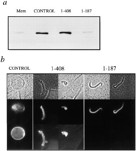Figure 5. Lamin accumulation in nuclei inhibited by LAP2 fragments. (a) Western blot of nuclei assembled in the presence of the indicated LAP2 fragment. Nuclei were assembled for 3 h and pelleted; the pelleted proteins were separated by 12% SDS-PAGE and immunoblotted with a monoclonal anti-lamin antibody (see Materials and Methods). (b) Lamins detected by indirect immunofluorescence in nuclei assembled for 3 h in (left to right): a control reaction (buffer added), a reaction containing 3 μM LAP2 fragment 1–408, and a reaction containing 5 μM LAP2 fragment 1–187. Nuclei were processed for immunofluorescence as described in Materials and Methods. Upper panels, contrast images; middle panels, DNA visualized with Hoechst; bottom panels, lamins visualized by a Texas red–conjugated secondary antibody.