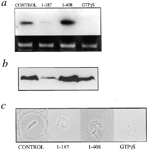 Figure 6. DNA replication and lamin blots of nuclei inhibited by LAP2 fragments. Nuclei were assembled for 3 h in the presence of α[32P]dCTP plus either buffer, 3 μM LAP2β fragment 1–408, 5 μM LAP2 fragment 1–187, or 1 mM GTPγS. (a) Total DNA was prepared from aliquots of each sample, electrophoresed on a 0.8% agarose gel, and the gel dried and exposed to film (see Materials and Methods). Upper panel shows the autoradiograph of dried agarose gel; the lower panel shows the ethidium stain of the same gel as a control for DNA loading. (b) Protein from each sample was blotted and probed using a monoclonal anti-lamin antibody (see Materials and Methods). (c) Corresponding phase-contrast images of a typical nucleus from each sample in a.