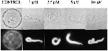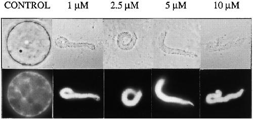 Figure 10. Inhibition of nuclear assembly by Xenopus LAP2 fragment 1–164. Nuclei were assembled for 3 h in reactions containing the indicated concentration of fragment 1–164. Upper panels show phase-contrast images; lower panels show DNA as visualized by Hoechst. Xenopus fragment 1–164 gives the same arrest phenotype as human fragment 1–187, but at lower concentrations.