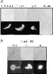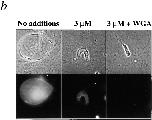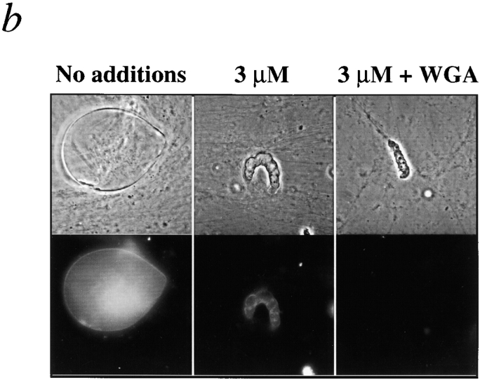 Figure 2. Inhibition of nuclear growth by human LAP2β fragment 1–408. (a) Nuclei assembled for 1.5 h in reactions containing the indicated concentration of fragment 1–408. The small phase-dense black dots (center of control nucleus) are coiled bodies, which form only in transport-competent nuclei. Upper panels show phase-contrast images of representative nuclei; lower panels show corresponding DNA, as visualized by Hoechst staining. (b) LAP2-arrested nuclei import a fluorescent karyophilic substrate. Nuclei were assembled for 2 h in the presence or absence of 3 μM LAP2 fragment 1–408, supplemented with rhodamine-conjugated nucleoplasmin, and viewed by epifluorescence 30 min later. As a negative control, WGA, which inhibits nuclear import, was added to samples 5 min before adding nucleoplasmin (right panels). Upper panels show phase-contrast images of representative nuclei; lower panels show the corresponding nuclei by rhodamine fluorescence, indicative of transport activity.