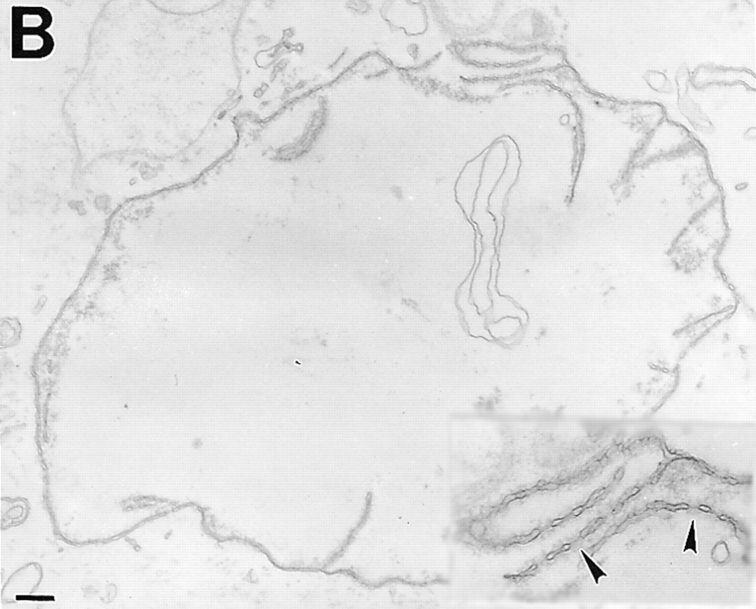 Figure 4. TEM of nuclei inhibited by human LAP2 fragments. (a) Positive (buffer) control: nucleus assembled for 3 h. (b) Nucleus assembled for 3 h in a reaction containing 3 μM fragment 1–408. Insets in a and b are higher magnifications to show NPCs. Arrows in b indicate regions where the inner membrane appears to invaginate. (c and d) Nuclei assembled for 3 h in a reaction containing 10 μM LAP2 fragment 1–187. Arrowheads indicate NPCs. Bars, 500 nm.